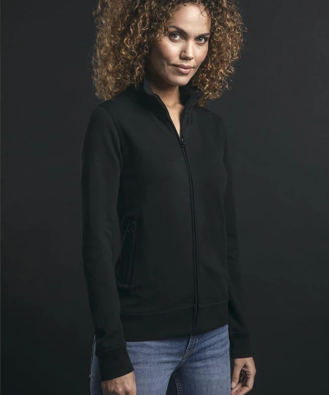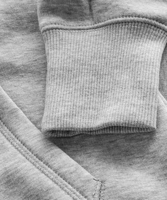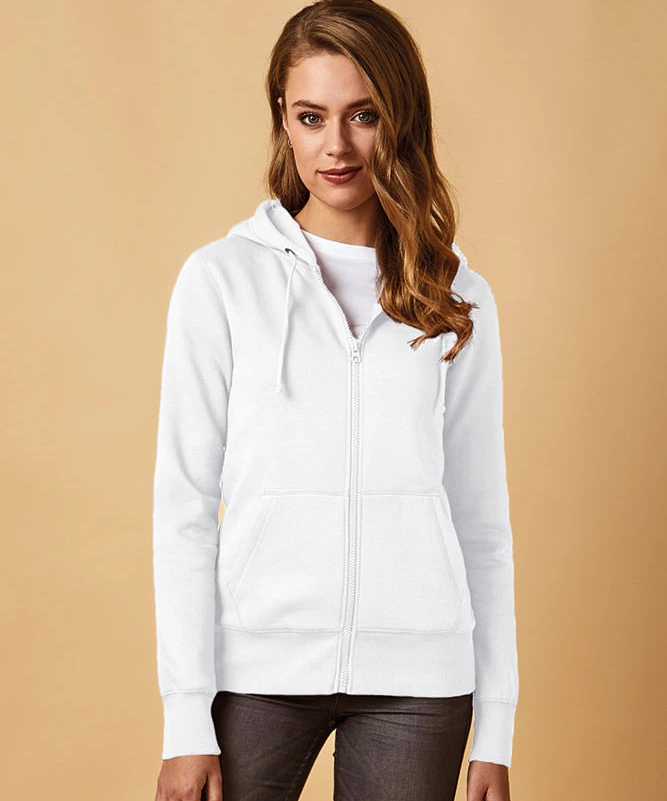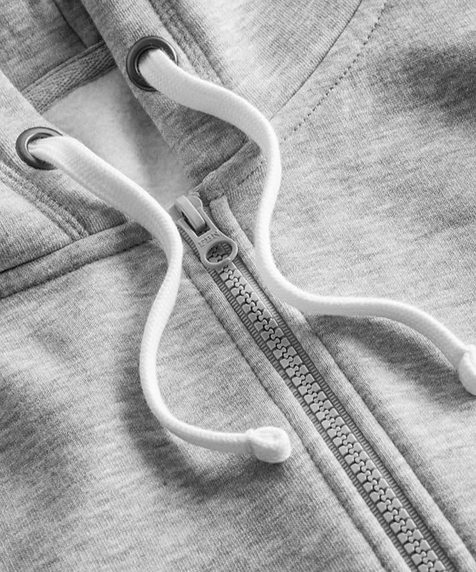 Sweatjacke, durchgehender Ton in Ton Reißverschluss, Doppelkapuze, wechselbare Kordel, Kängurutaschen, breite Elasthanbündchen an Ärmeln und Saum, Flatlock-Nähte, neutrales Größenetikett, leicht tailliert, Molton-Brushed, 70 % Baumwolle, 30 % Polyester, 280 g/m², XS–XXXL. Farbe heather grey: 62 % Baumwolle, 33 % Polyester, 5 % Viskose