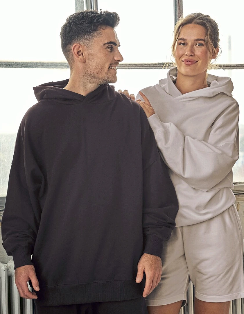 Gekämmte Bio-Baumwolle im Übergang | Fleece mit gebürsteter Rückseite | Oversize-Passform | Doppelt gefütterte Kapuze | Überschnittener Schultern | Ohne Etikett